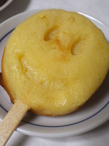 パンケーキ生地をスティックに指して、ペロペロキャンディの様に仕上げている。