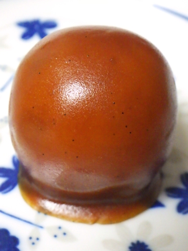 中はサツマイモ「あけの金時」の餡で、それを自家製キャラメル羊羹でコーティングしている。そんな事もあり、外側は若干べったりしているので、指で摘む際は注意が必要。
