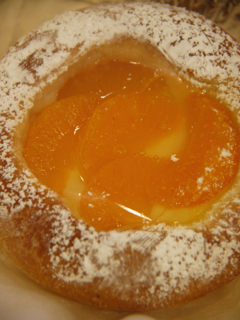 カスタード入りのふかふかのパンに、オレンジとゼリーをトッピング。
