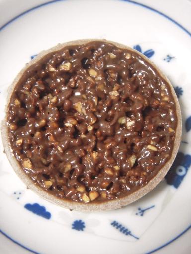 サクサクの、最中風の生地に、ナッツ(細かく潰したアーモンド)を塗し、ココアで焼き固めている。