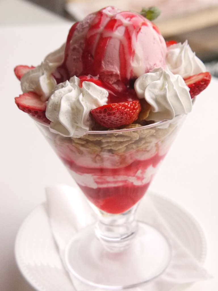 容器に苺、苺ソース、生クリーム、ヨーグルト、コーンフレーク、苺アイス、カット苺を盛り付けている。