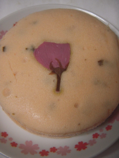 焼目が全く無い(蒸しているのだから当然である)、ふんわりとした生地には、桜の花が中心に埋め込まれている。