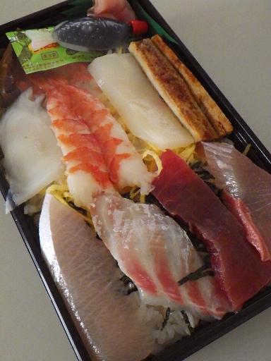 箱に寿司飯を敷き詰め、錦糸玉子と刻み海苔を重ね、その上に様々な大きめにカットされた魚介(タコ、エビ、イカ、穴子、ハマチ、カンパチ、マグロ等)やおかず(椎茸)を並べている。
