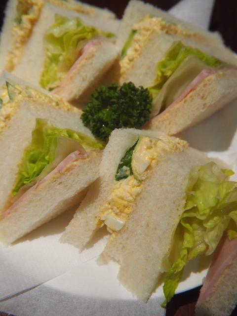 エッグサラダとキュウリのサンドウィッチと、ハムとレタスのサンドウィッチが提供される。