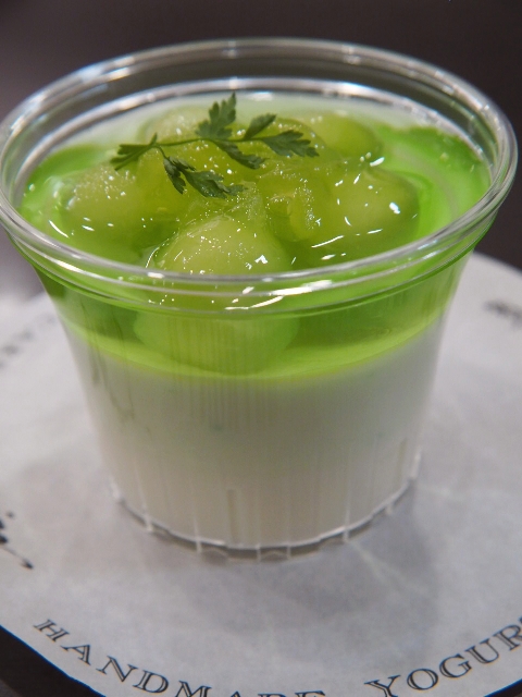 ヨーグルトの白と、メロンやメロンゼリーの薄緑が、色鮮やかに映る。