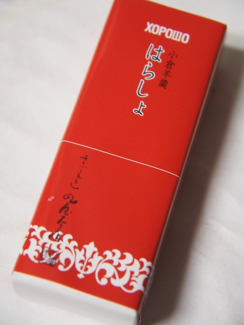 キリル文字が入っていて(ハラショーとは、ロシア語で「素晴らしい」の意)、エキゾチックな味の羊羹なのかなと思いきや、ごく普通の小豆の羊羹。