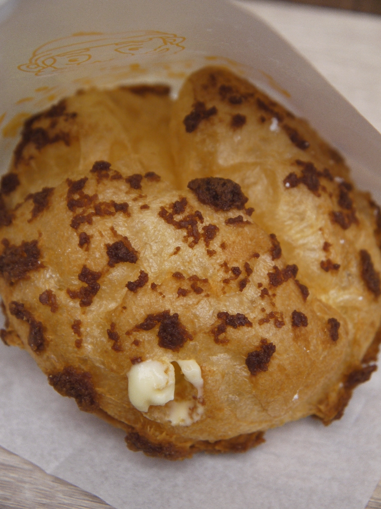 カリカリに焼き上げた生地(通常のふかふかのシュー生地に若干焦げ目を付けてカリカリにしたもので、他社が提供するクッキーシューの生地とは発想が異なる)の中に、カスタードクリームがたっぷりと。