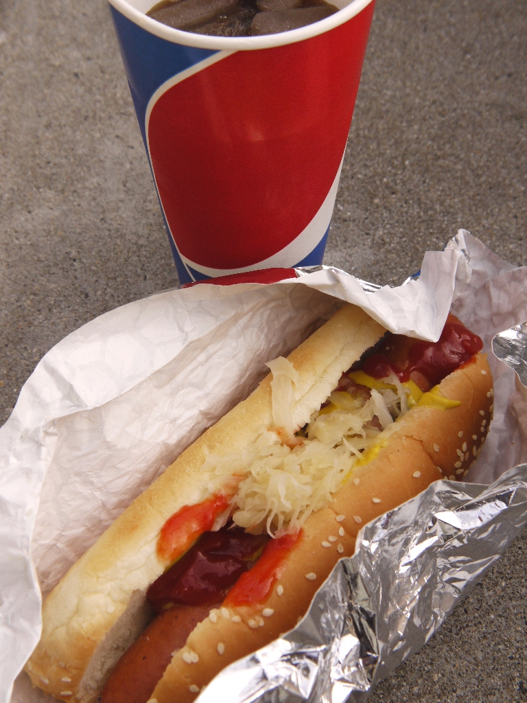 レリッシュ、マスタード、ケチャップは、専用の装置が設けられているので、そこで好きなだけ掛ける。