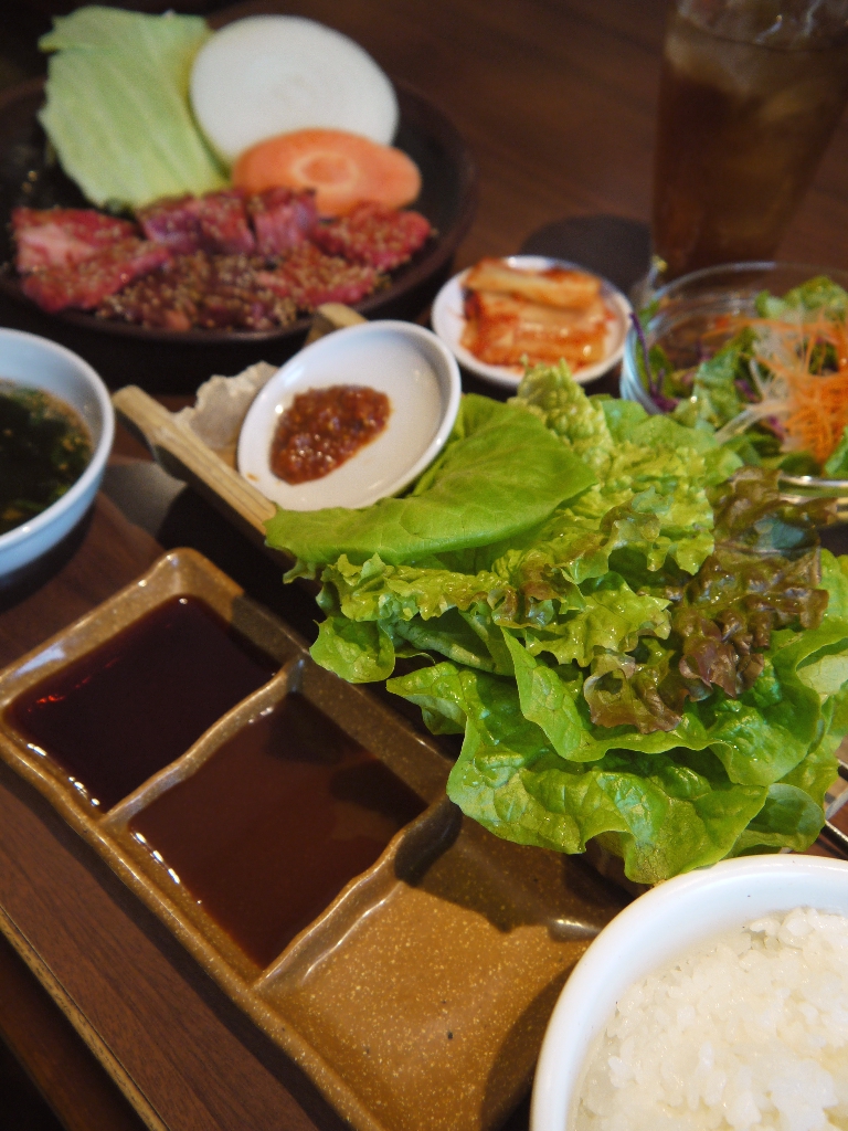 焼肉、野菜、サンチェ(包菜)、スープ、キムチ、ライスから成る。ライスとサンチェはお替り自由、となっている。