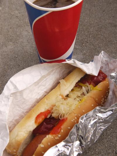 ホットドッグパンに、極太のウィンナー(1/4ポンド(113g)以上)を挟んでいる。