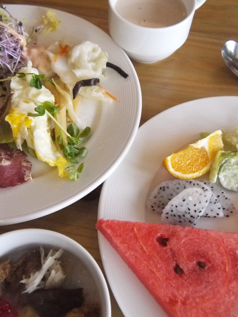 提供される料理は、洋食がメイン。台湾とあって、粥、ルーローハン、麺類が提供される。カットフルーツも、日本のと比較してトロピカル(ドラゴンフルーツがあった)。