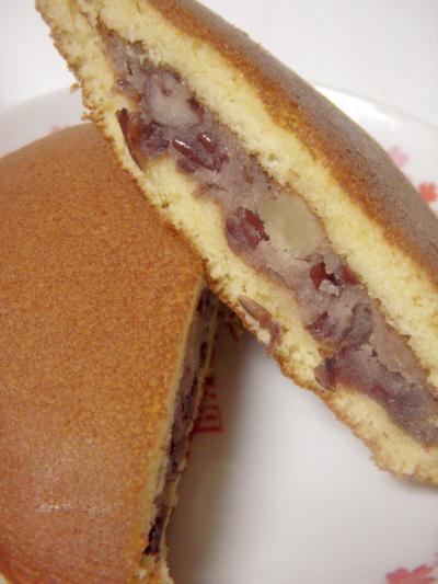 カットした栗を含んだ小豆餡を、お馴染みのしっとり・ふんわりのどら焼生地で挟んでいる。