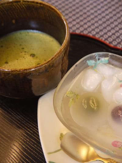 漉し餡を、葛やわらび粉で包んでいる。透明な生地の中で小豆漉し餡と抹茶餡が浮かんでいる様で、夏に相応しい、涼しげなお菓子になっている。