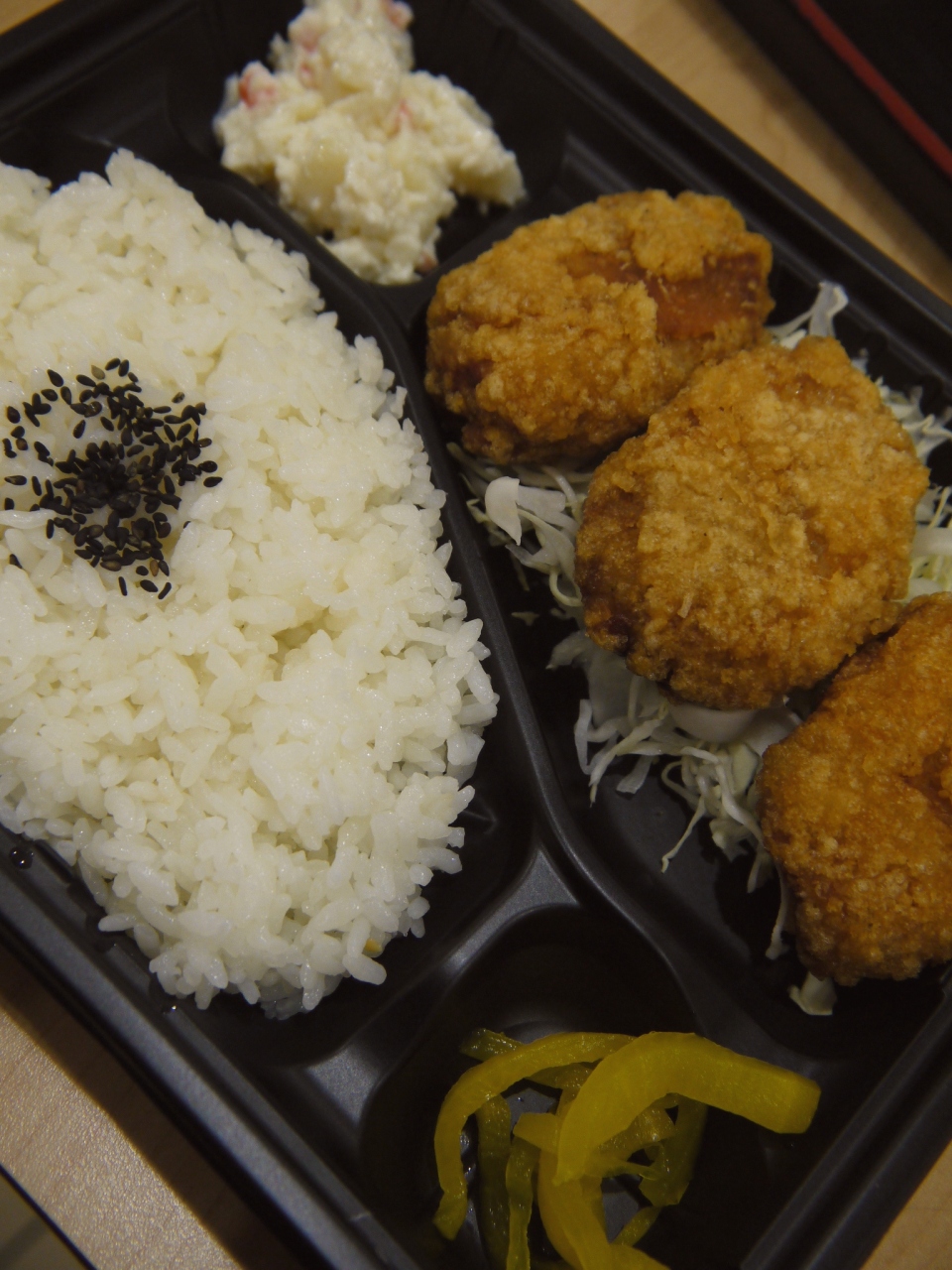 唐揚げ3個、ポテトサラダ、漬物、刻みキャベツ、そしてご飯から成る。