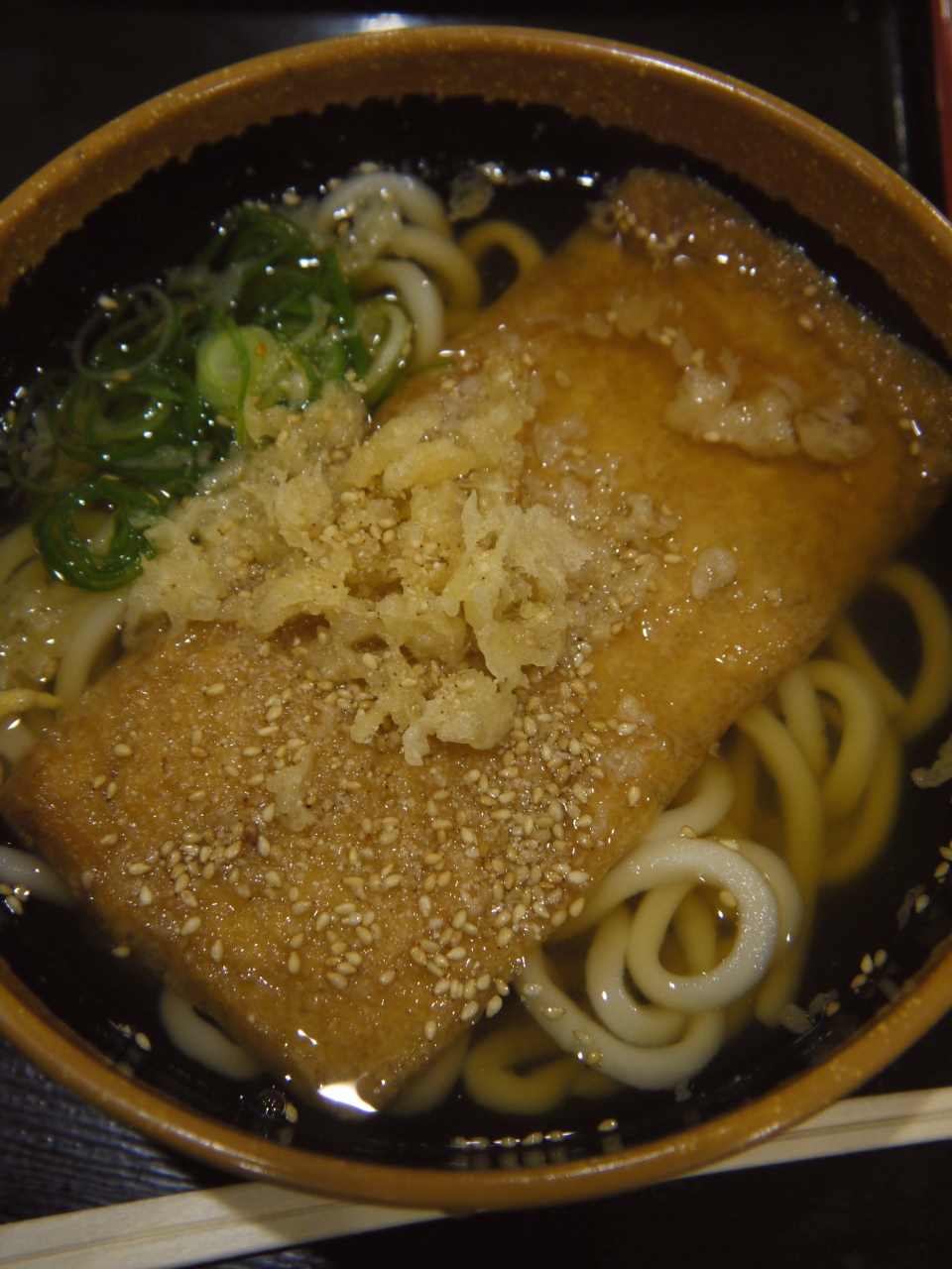 うどんに、1枚の大きな甘く味付けした油揚げと、ネギがトッピングされている(天かすは、食べる直前に客がトッピングする)。