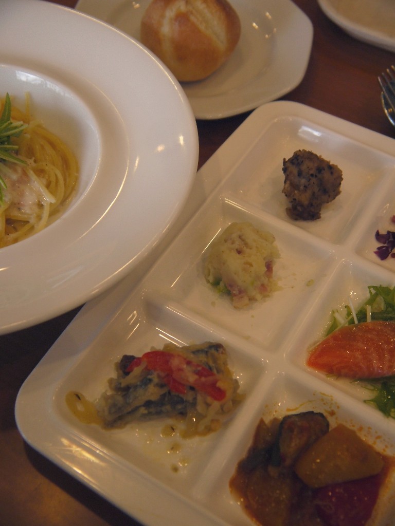 パスタ、デリ9品盛り合わせ、パン、そしてプチデザートから成る。