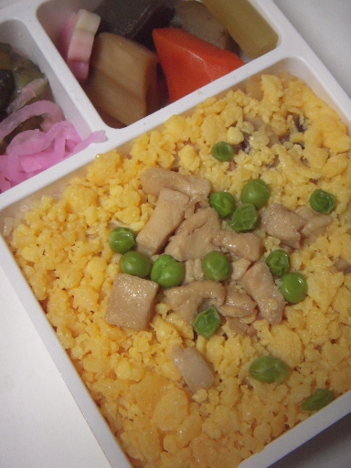 椎茸飯(国産米使用)に玉子そぼろと鶏肉を重ねたもの(まさに親子飯)をメインに、煮物(こんにゃく、人参、蓮根、ゴボウ、ふき、麩、その他)とお新香を添えている。
