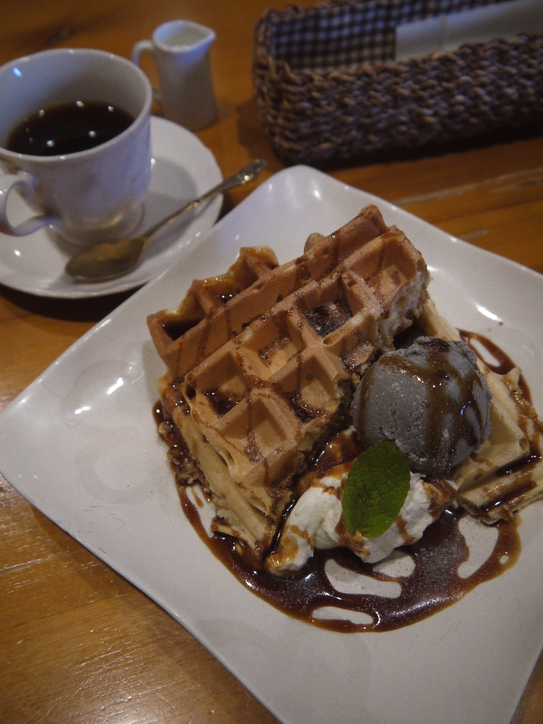 アイスクリーム(数種類から選べ、今回は黒胡麻を選択)と、生クリームが添えられ、全体に黒蜜を回し掛けてあり、和洋折衷のワッフルに仕上がっている。