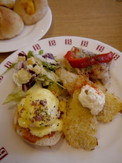 1枚の皿に、国産野菜のサラダ、白身魚のカツレツ、エッグベネディクト、グリルチキンが盛られている。