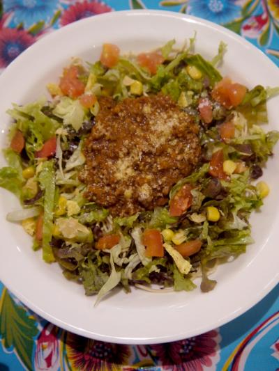 極細の麺に、タコスの具(レタス、ミートソース、トマト、コーン)をトッピング。