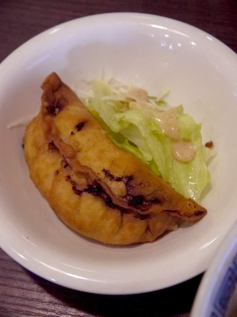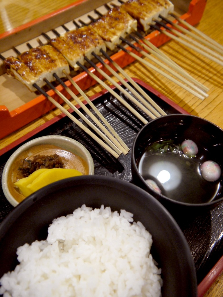 とうふ田楽は、伊賀の郷土料理らしい。小さめにカットした豆腐に串を刺し、味噌を付けて炙ったもの。食す際は、串から外す(ご飯の上で外すと綺麗に食べられる)。濃厚な味噌と、弾力のある豆腐との相性は良い。素朴な料理。一見物凄い量が提供されるが(最初見た時は何人分か、と思ってしまった)、ぺろりと平らげられる。