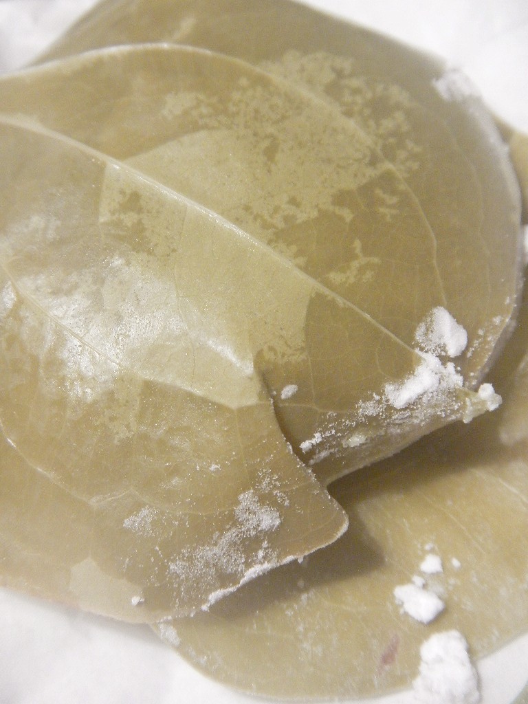 柏餅は柏の葉で包まれているが、このいばらもちはいばら(サルトリイバラ)の葉で包まれている。中は粒餡入りの餅。