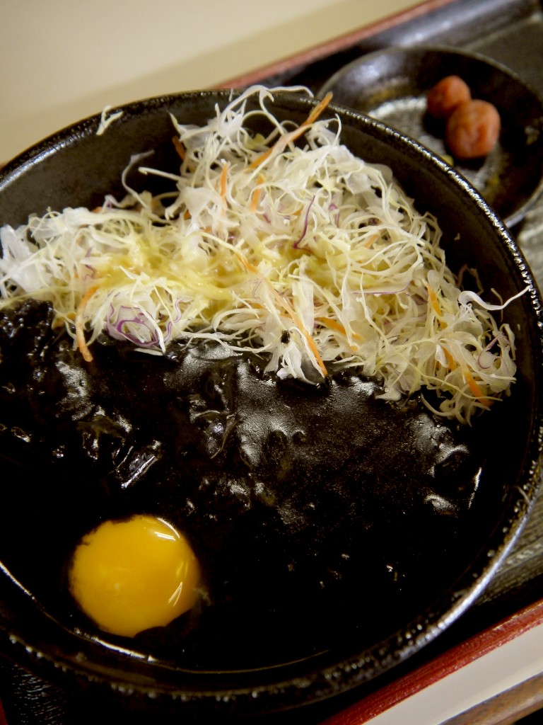 丼に黒米を盛り、半分に黒カレーをかけて生卵を落とし(月夜を表現しているのか)、もう半分に千切りキャベツを盛っている。