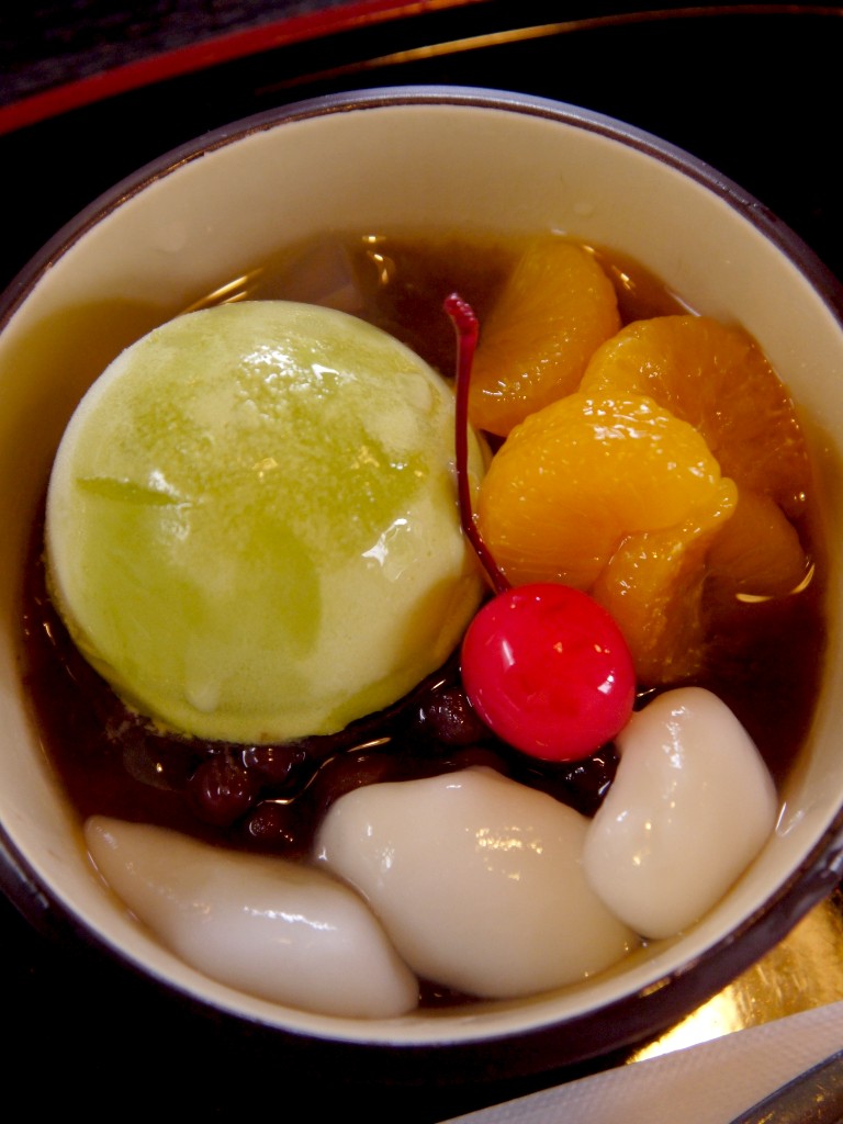 小豆の甘みと、抹茶のほんのりとした苦味、そしてフルーツの甘酸っぱさを感じられる。