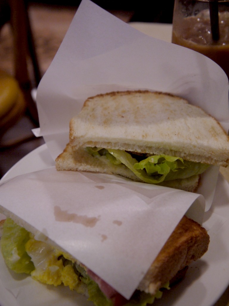 トーストされたパンの間に、ハム(ポークパストラミ)、スクランブルエッグ、レタスを挟んでいる。カフェに相応しいサンド。
