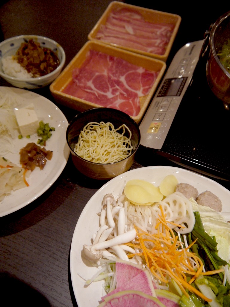 ダシが2種類鍋に提供され、三元豚の肉が2種類(バラとロース)が提供される。
