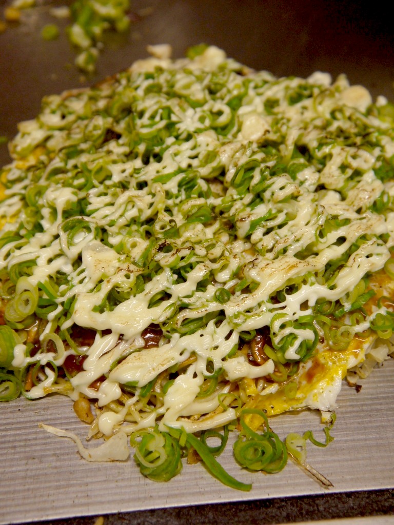 通常の肉玉そばのお好み焼に、ネギをたっぷりトッピングし、マヨネーズをかけ、バーナーで軽く炙って仕上げてある。