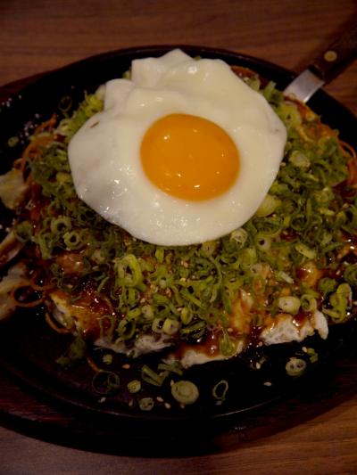 通常のお好み焼に、目玉焼き、ネギ、イカ天、大葉を加えている。