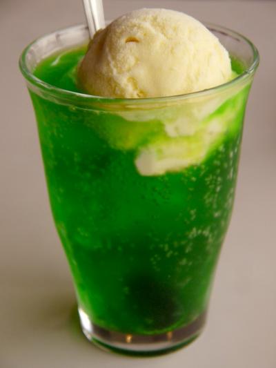 メロンソーダに、バニラアイスを1スクープ分添えたもの。