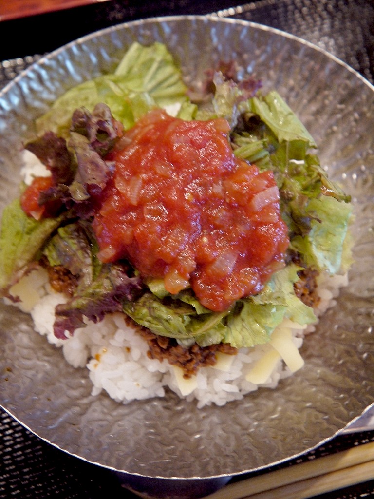 タコライスは、メキシコ発祥のアメリカンファストフードのタコスと、ご飯を合わせたもの。要するに、ライスにタコスの具(レタス、挽肉、サルサソース)を乗せている。混ぜていただくのが正しいらしい。