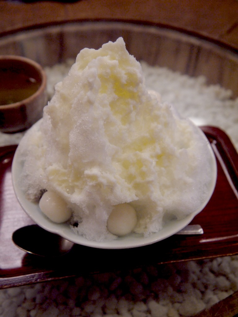 器に小豆(丹波大納言だという)を盛り、その上にかき氷を乗せ、練乳をたっぷりと掛け、白玉を添えている。