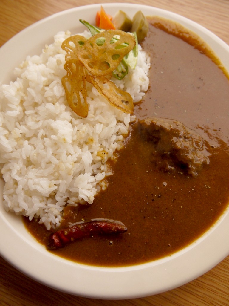ビーフカレーに、様々な野菜をトッピング。トッピングされる野菜は、その日によって異なるらしい。今回は、蓮根をカリカリに揚げたもの、オクラ、そしてピクルスだった。