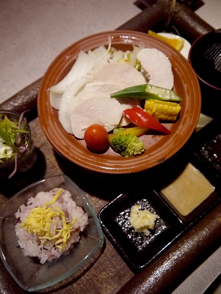 塩麹で一晩漬け込んだ鶏胸肉は2時間掛けて蒸し上げたものだとか。それに、オクラ、トマト、コーン、赤ピーマン等の野菜が彩りを添えている。