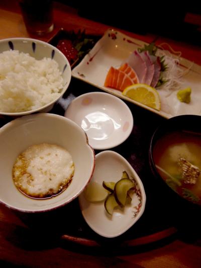 刺身の盛り合わせ、小鉢(この日は山芋)、漬物、汁物(カニ汁)、ご飯から成る。