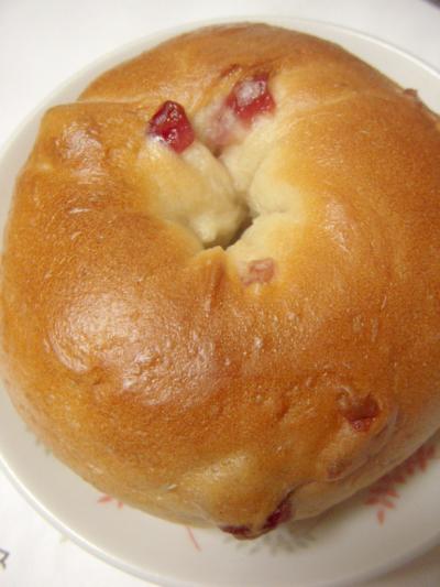 ベーグルは、基本的に甘くない。これも、生地の部分はそう甘くはないが、クランベリーとホワイトチョコを練り込んでいるので、全体的に甘く感じる。