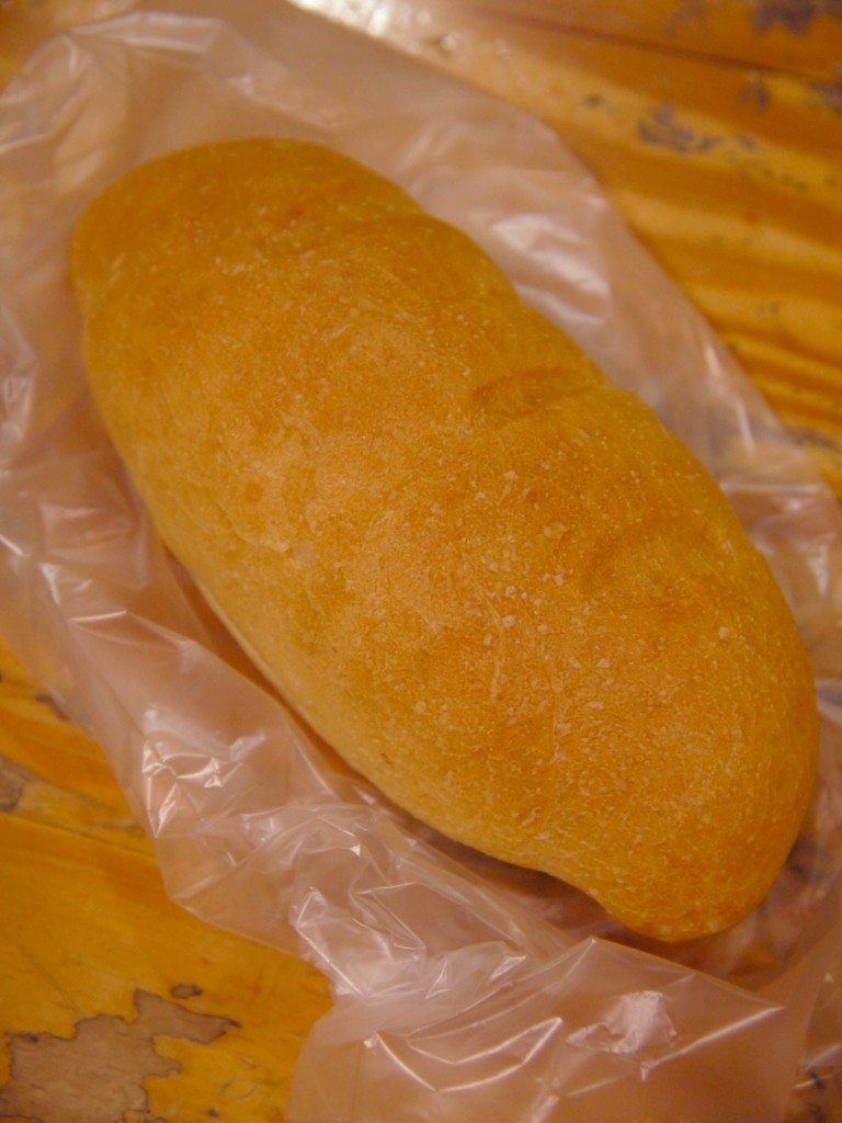 見た目はごく普通のパンだが(フランスパン、と名乗っている割には特徴的な切れ込みは無いが)、中にはカマンベールチーズがたっぷりと。