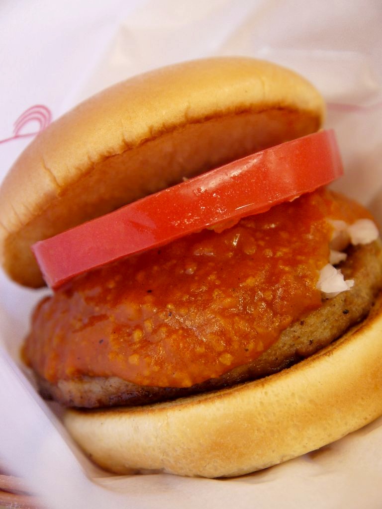 パテの他に厚切りのトマト、ミートソース、マヨネーズ和えの刻みオニオンを挟んでいて、上下にボリューム感を持たせている。- 旅行時期