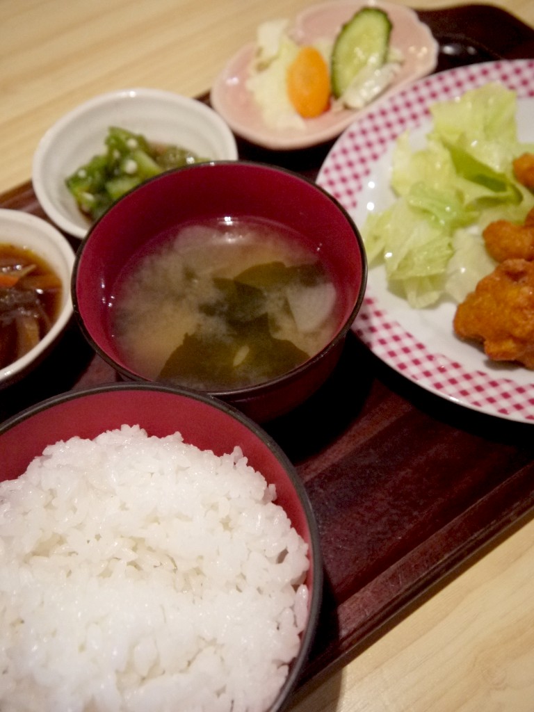 チリソースを掛けた鶏唐揚げ、小鉢2品、漬物、味噌汁、そしてご飯から成る。