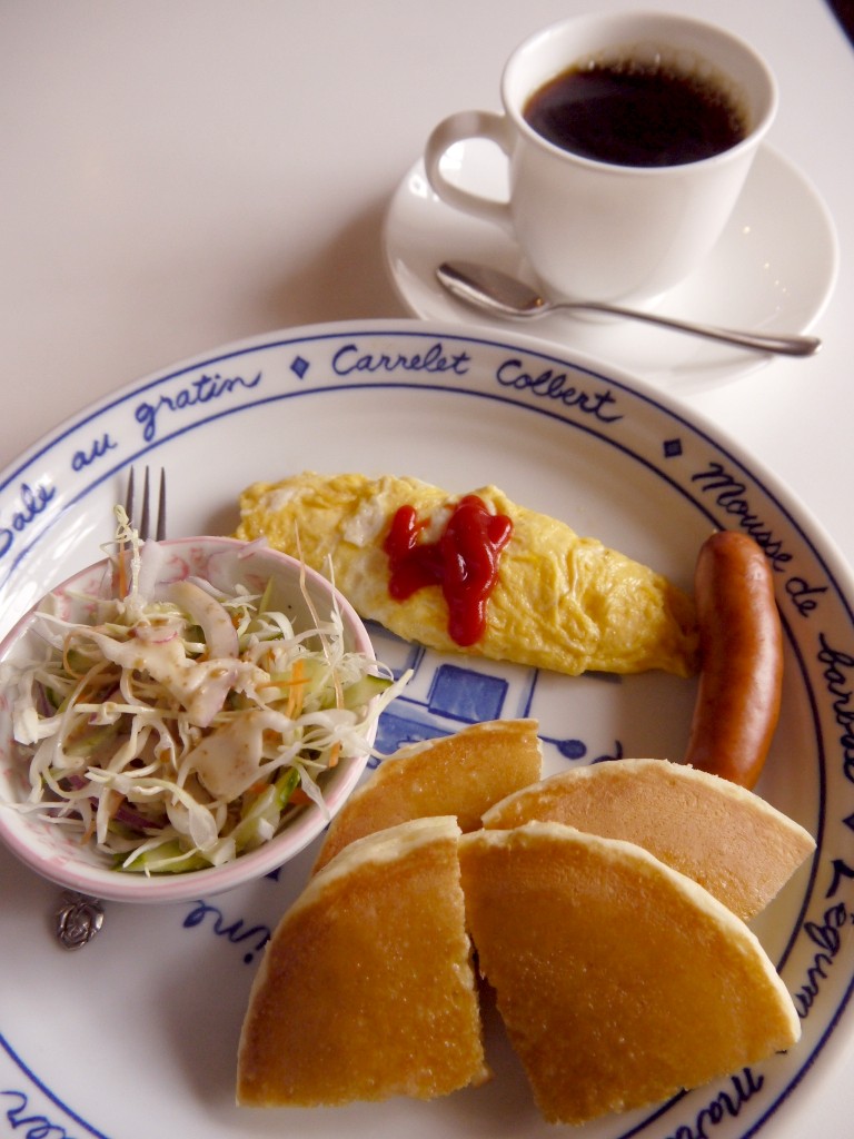 お品書きでは、トースト、サラダ、ウィンナー、玉子、ブレンドコーヒーから成る、となっていたが、実際にはトーストの代わりにパンケーキが提供された。パンケーキの方が手間が掛かる気がするので、何故トーストにしなかったのかは不明。