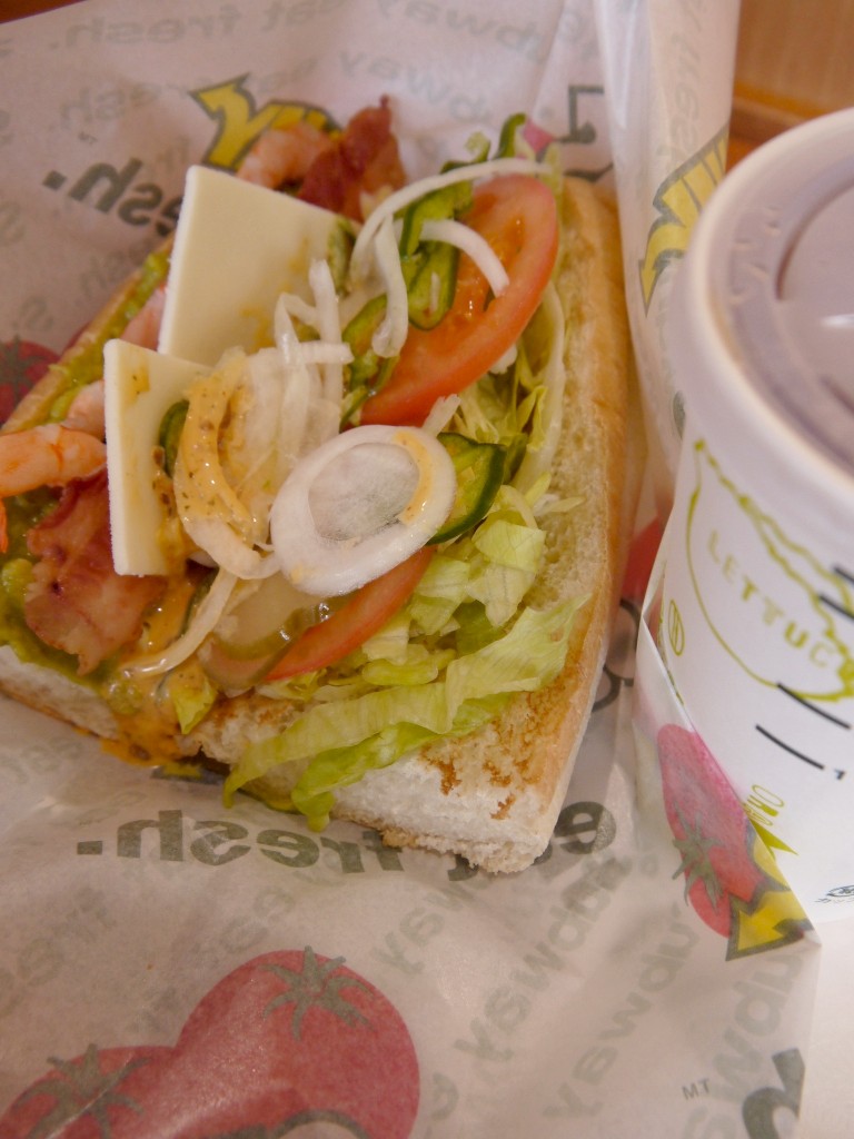 パンの間に、海老とアボカドペーストをメインに、レタス、トマト、オニオン、ピーマン等の野菜をたっぷりと。特製コブサラダソースを掛けている。- 旅行時期