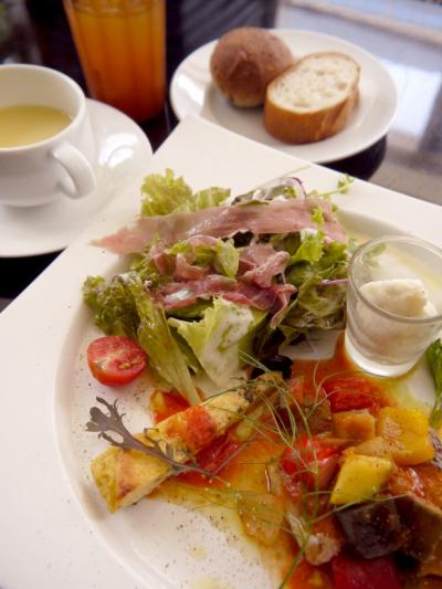 メインとなるプレートに、太刀魚のポワレ自家製ラタトゥイユとバジリコ、キッシュ、生ハムのサラダ、ポテトサラダが彩りよく、抽象アートの如く盛られていた。