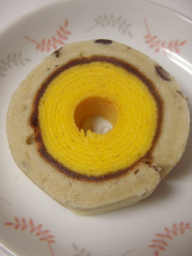 カボチャ風味のバウムクーヘンを、小豆入りのスポンジケーキで巻いたもの。