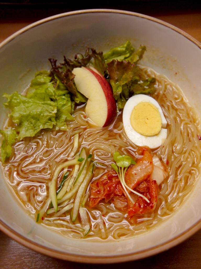 具は、キムチ、胡瓜、レタス、玉子、そしてリンゴ(盛岡冷麺は、フルーツを添えるのが一般的らしい)。肉類は使われていないのは残念といえば残念。