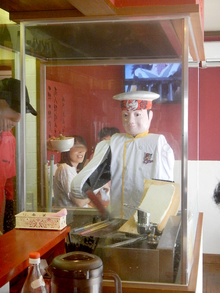 最大の特徴は、店内にある刀削麺用の機械というか、ロボットによって作られた麺(注文毎に店長が生地を機械にセットし、麺を作らせる)。塊状の生地を、刀で削ぐようにして麺にして、そのまま茹でる、という製法。太さや厚みに微妙な差があり、食感にコントラストがある。全体的には、モチモチとした、弾力ある麺。- 旅行時期