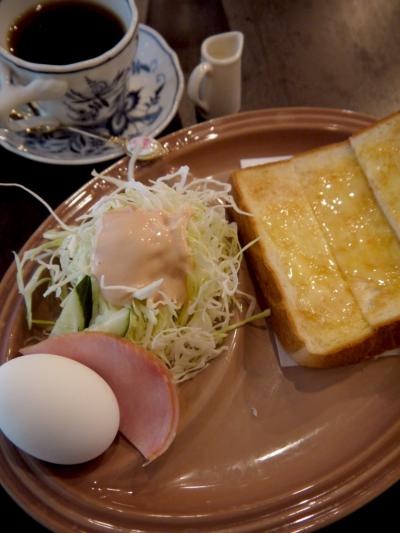 トースト、茹で卵、ハム、サラダ、ドリンク(基本はコーヒー)から成る。