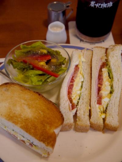 トーストした食パンの間に、ハム・トマト・玉子サラダ・レタスを挟んでいる。